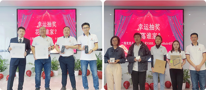 本次年会的重头戏--幸运抽奖活动,现场气氛热烈无比。一等奖:韶音OpenRunPro骨传导蓝牙耳机 ;二等奖:天猫精灵V10SE、华FreeBuds4E耳机; 三等奖:小米手环7、小米体脂秤。幸运抽奖最后花落谁家?