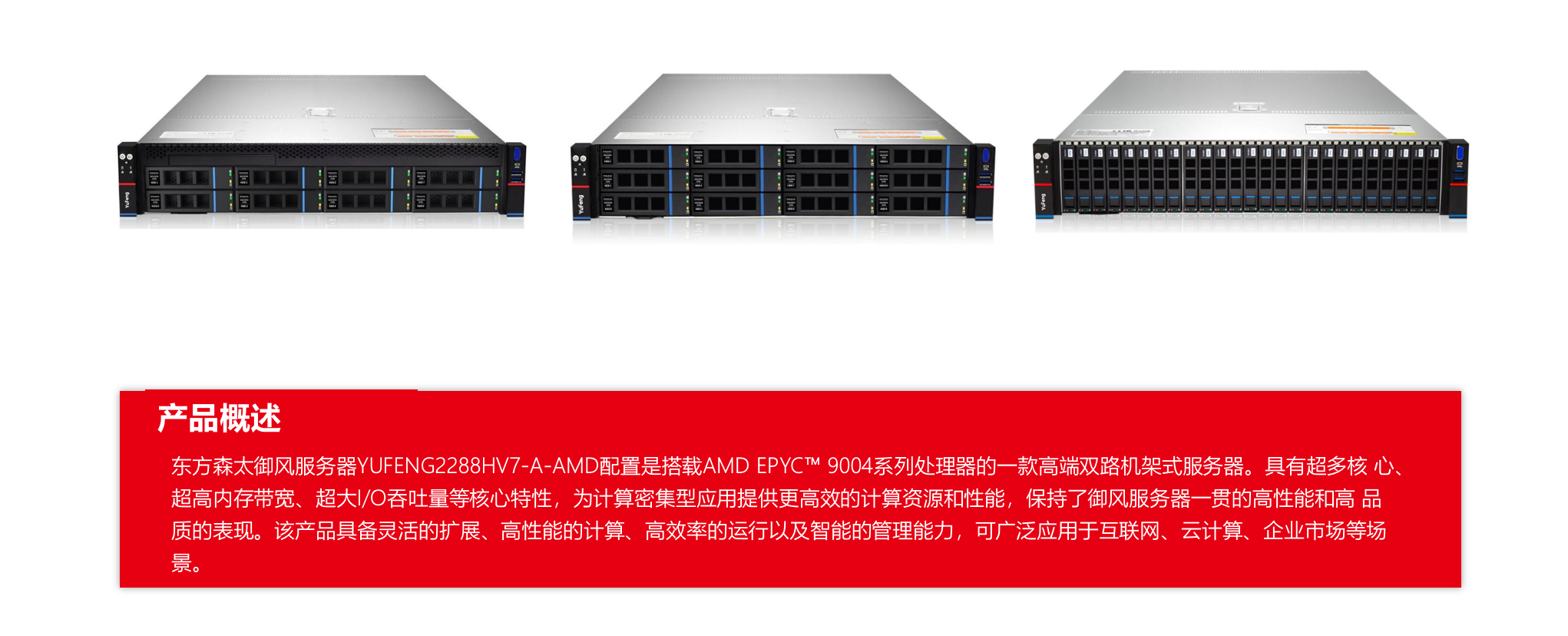 - 灵活拓展:2U空间基于AMD EPYCTM 9004系列处理器打造,可支持24条DDR5内存,最多6T的内存容量,存储支持多规格硬盘与NVMeSSD组合,8个PCIe5.0扩展槽满足多元扩展需求。