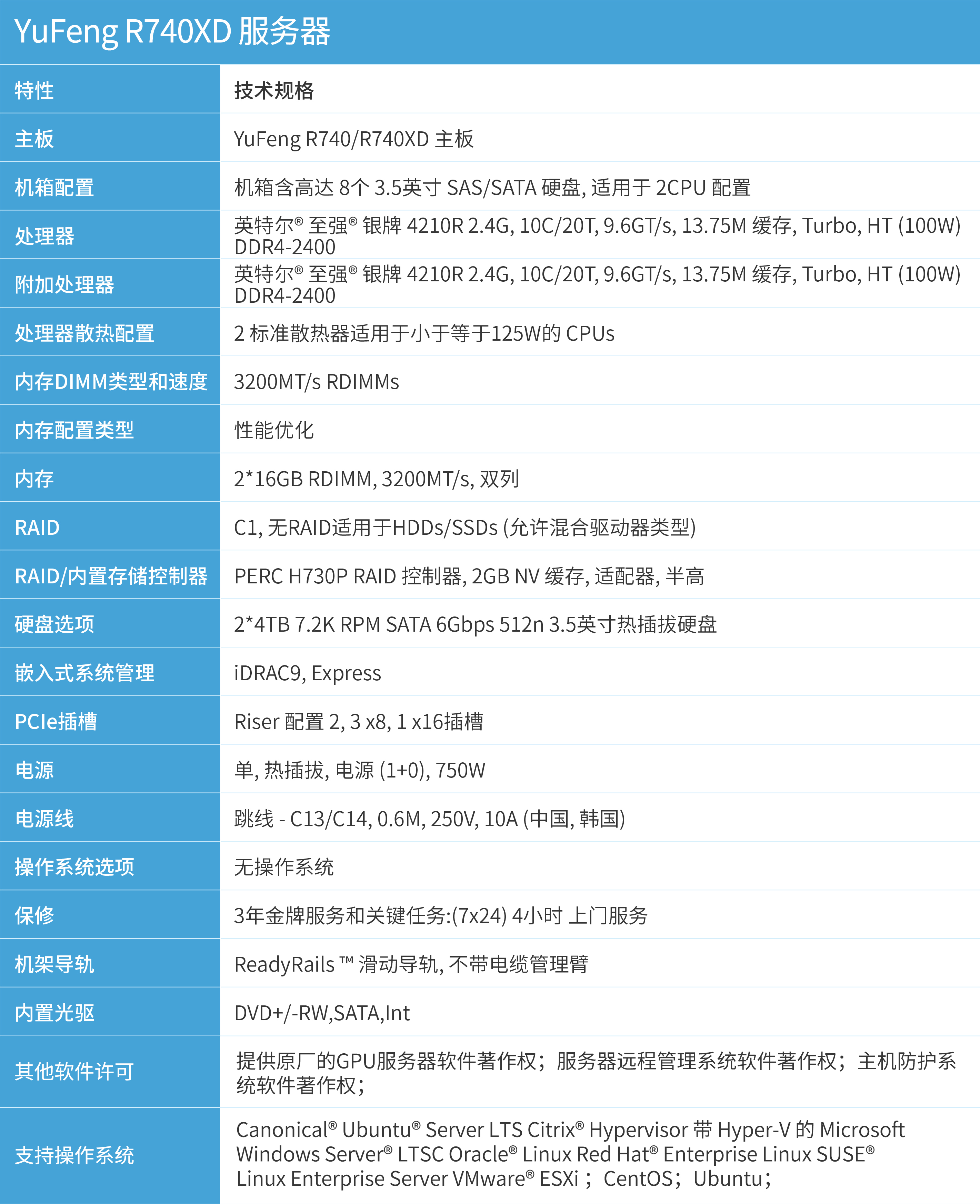借助YuFeng服务器转变数据中心,满足现代应用程序和操作需求。存储性能和灵活性为软件定义存储或数据集处理和分析提供了出色的平衡。