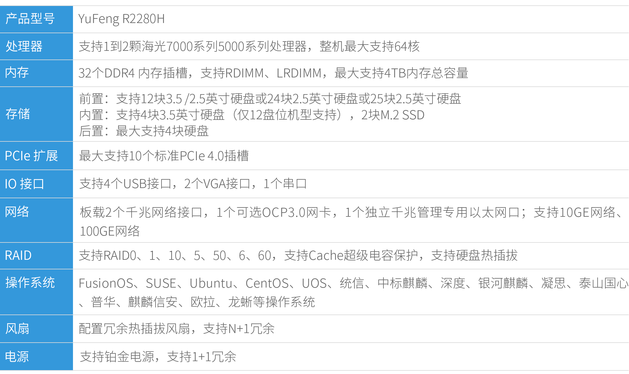 YuFeng R2280H 是基于最新海光7000 处理器的 2U 机架式服务器,是一款面向企业级应用及数据中心的服务器产品,同时提供高 性能、安全可靠的存储平台,支持多种阵列选择,并配置智能管理系统,提供丰富的数据保护功能,轻松实现远程的数据管理和保护。