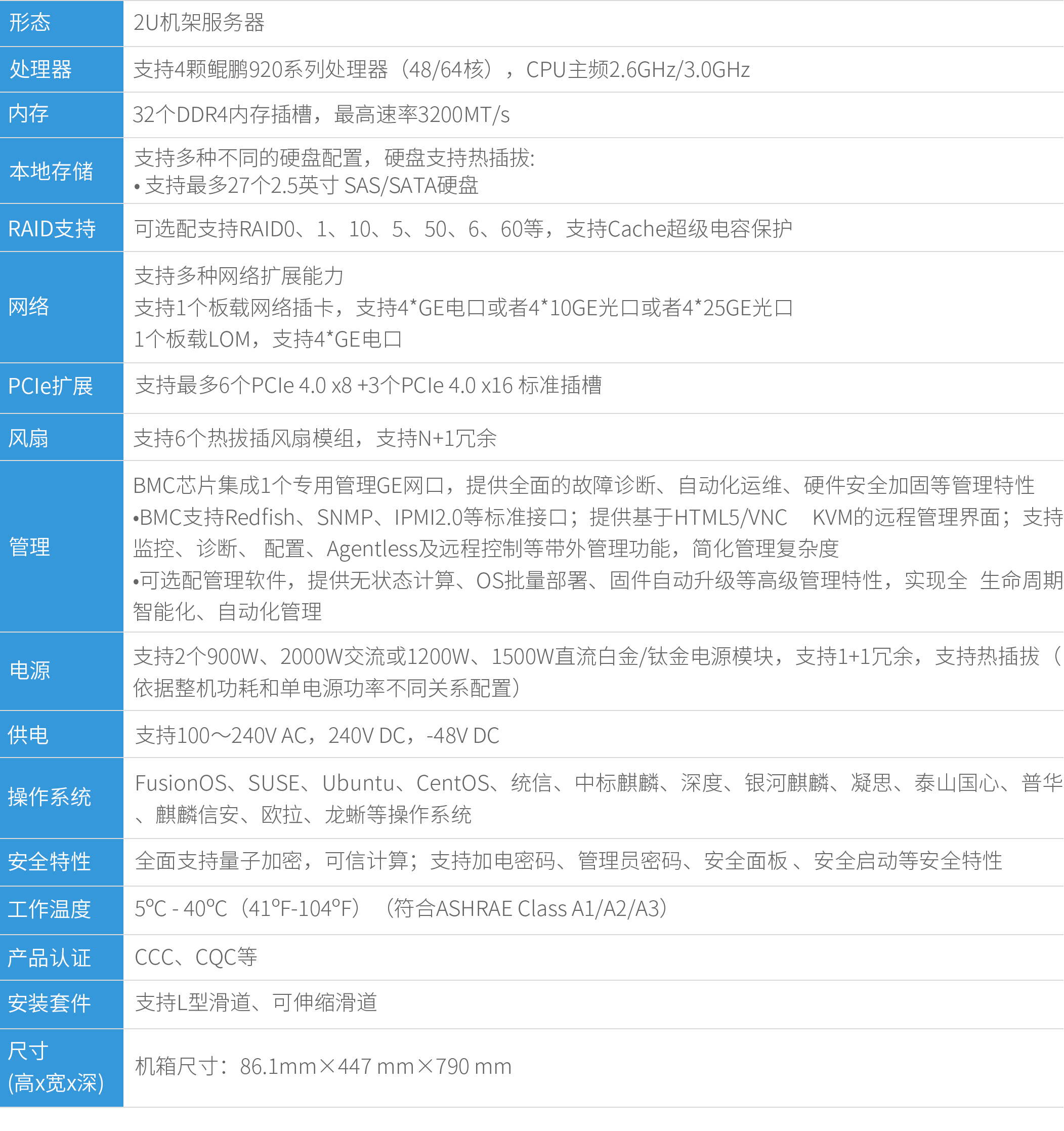 •支持4颗鲲鹏920处理器,单CPU最高支持64个计算核心