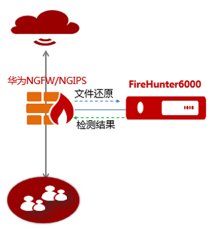 与NGFW/NGIPS设备联动部署:NGFW/NGIPS设备负责还原文件,并将需要检测的文件送到沙箱进行检测。同时NGFW/NGIPS设备还支持SSL流量解密,针对解密后的流量做文件还原,再送沙箱检测。
