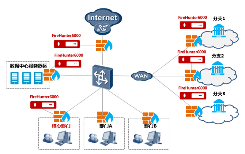 > 数据中心边界:重点保护服务器核心资产,发现内网潜伏的攻击、恶意扫描,渗透等